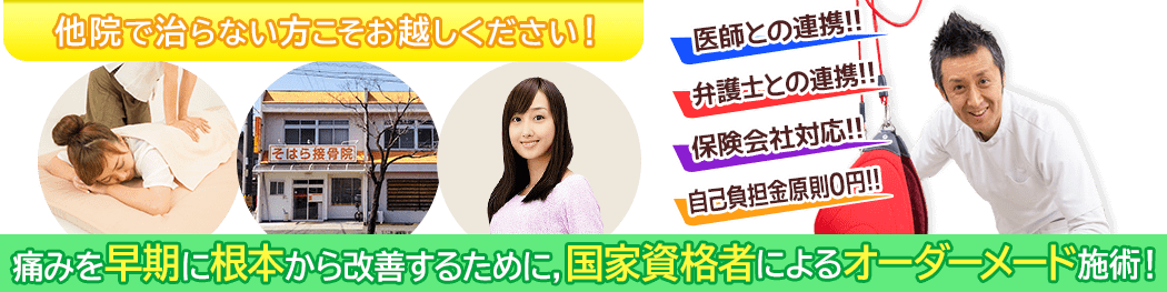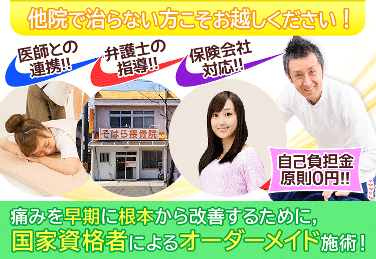 後遺症の痛みを一時的に解消するのではなく、根本改善を目指して、しっかりと対応させていただきますので、諦めてしまわずに、まずはそはら接骨院にご相談ください。